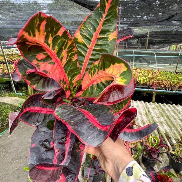 Окрас кротонов зависит от сезона. Даже яркие сорта могут приехать с зелеными листьями. По мере роста при достаточном количестве тепла и света при смене сезона они окрашиваются в сортовые цвета.