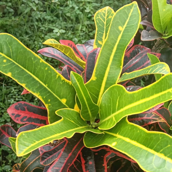 Окрас кротонов зависит от сезона. Даже яркие сорта могут приехать с зелеными листьями. По мере роста при достаточном количестве тепла и света при смене сезона они окрашиваются в сортовые цвета.