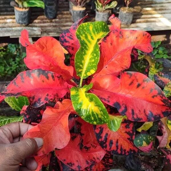 Окрас кротонов зависит от сезона. Даже яркие сорта могут приехать с зелеными листьями. По мере роста при достаточном количестве тепла и света при смене сезона они окрашиваются в сортовые цвета.