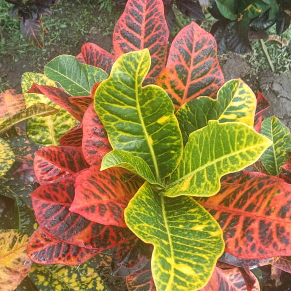 Окрас кротонов зависит от сезона. Даже яркие сорта могут приехать с зелеными листьями. По мере роста при достаточном количестве тепла и света при смене сезона они окрашиваются в сортовые цвета.