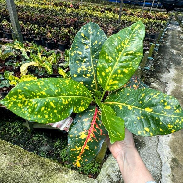 Окрас кротонов зависит от сезона. Даже яркие сорта могут приехать с зелеными листьями. По мере роста при достаточном количестве тепла и света при смене сезона они окрашиваются в сортовые цвета.