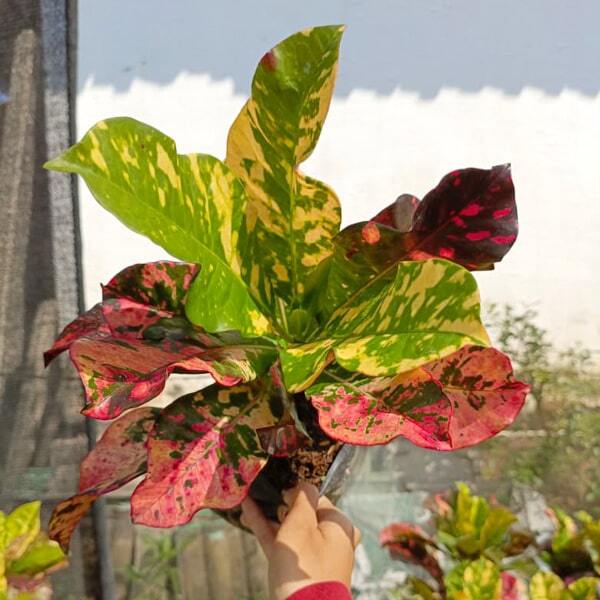 Окрас кротонов зависит от сезона. Даже яркие сорта могут приехать с зелеными листьями. По мере роста при достаточном количестве тепла и света при смене сезона они окрашиваются в сортовые цвета.