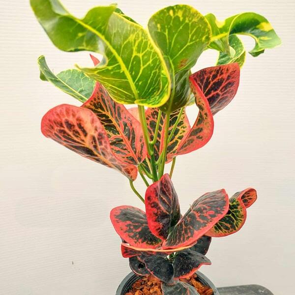 Окрас кротонов зависит от сезона. Даже яркие сорта могут приехать с зелеными листьями. По мере роста при достаточном количестве тепла и света при смене сезона они окрашиваются в сортовые цвета.