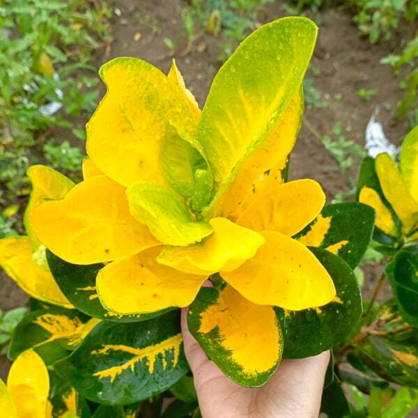 Окрас кротонов зависит от сезона. Даже яркие сорта могут приехать с зелеными листьями. По мере роста при достаточном количестве тепла и света при смене сезона они окрашиваются в сортовые цвета.