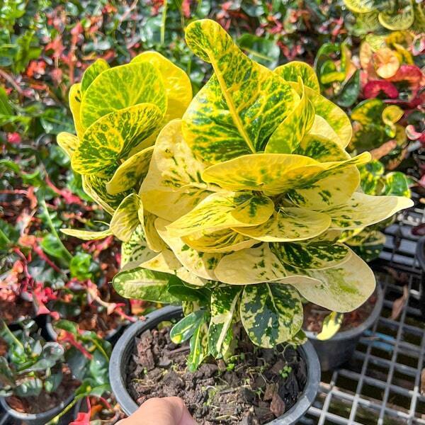 Окрас кротонов зависит от сезона. Даже яркие сорта могут приехать с зелеными листьями. По мере роста при достаточном количестве тепла и света при смене сезона они окрашиваются в сортовые цвета.