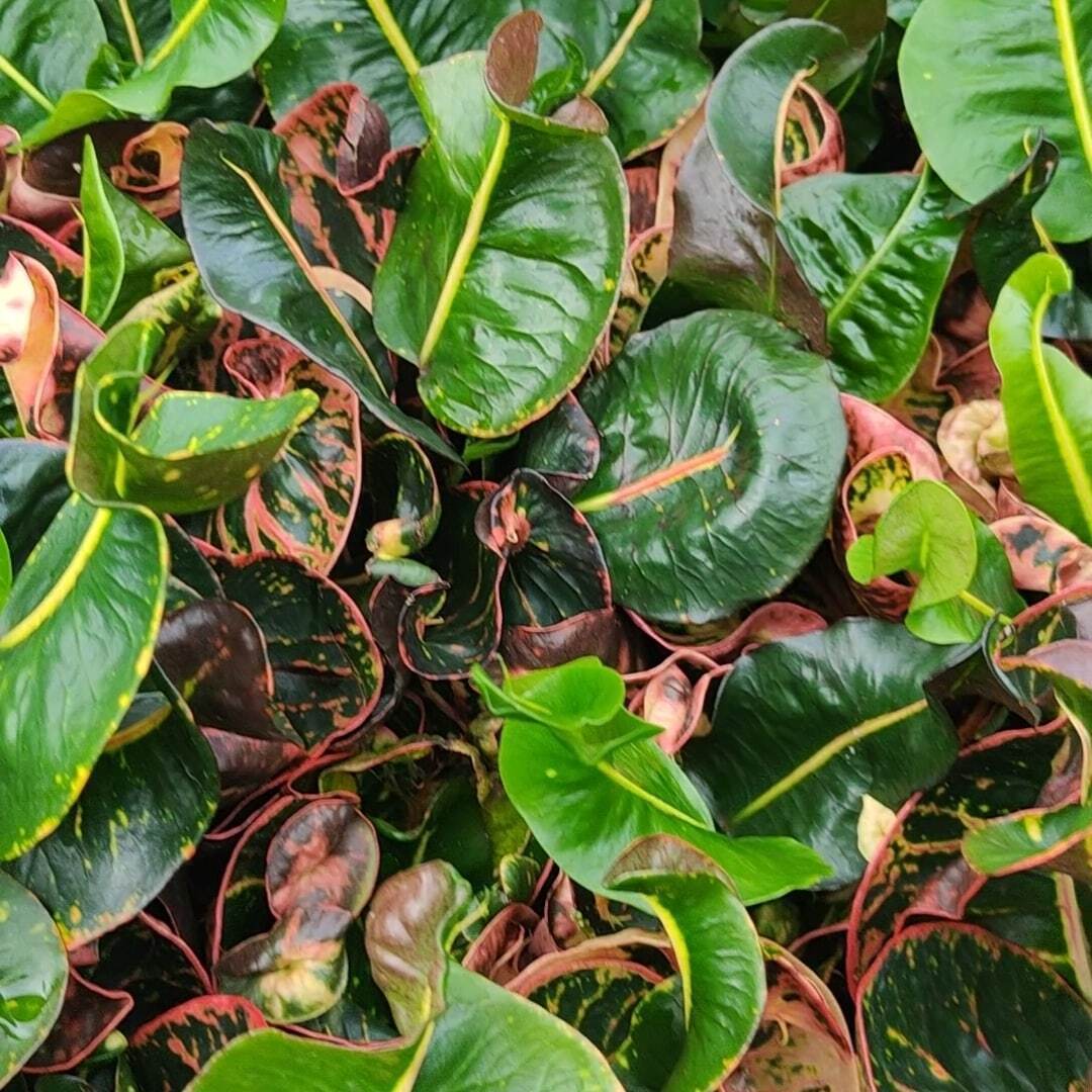 Окрас кротонов зависит от сезона. Даже яркие сорта могут приехать с зелеными листьями. По мере роста при достаточном количестве тепла и света при смене сезона они окрашиваются в сортовые цвета.