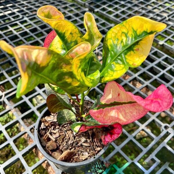 Окрас кротонов зависит от сезона. Даже яркие сорта могут приехать с зелеными листьями. По мере роста при достаточном количестве тепла и света при смене сезона они окрашиваются в сортовые цвета.