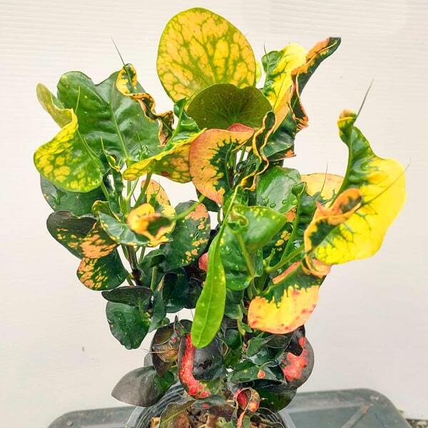 Окрас кротонов зависит от сезона. Даже яркие сорта могут приехать с зелеными листьями. По мере роста при достаточном количестве тепла и света при смене сезона они окрашиваются в сортовые цвета.