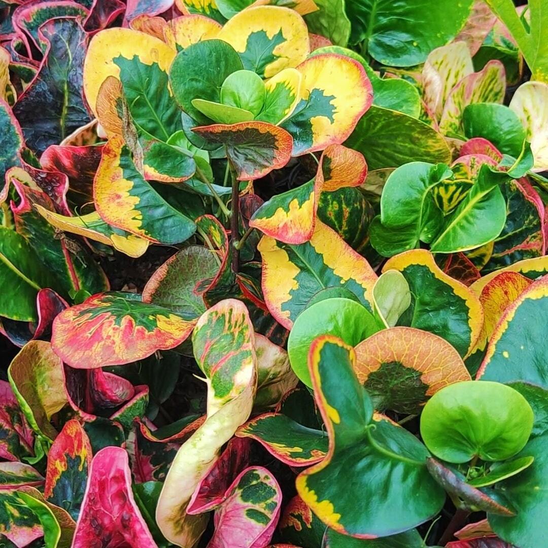 Окрас кротонов зависит от сезона. Даже яркие сорта могут приехать с зелеными листьями. По мере роста при достаточном количестве тепла и света при смене сезона они окрашиваются в сортовые цвета.
