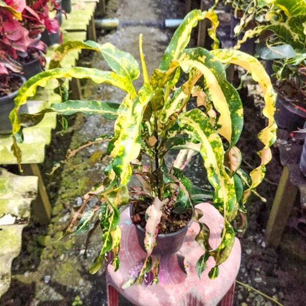 Окрас кротонов зависит от сезона. Даже яркие сорта могут приехать с зелеными листьями. По мере роста при достаточном количестве тепла и света при смене сезона они окрашиваются в сортовые цвета.