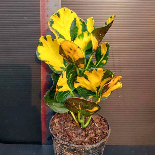 Окрас кротонов зависит от сезона. Даже яркие сорта могут приехать с зелеными листьями. По мере роста при достаточном количестве тепла и света при смене сезона они окрашиваются в сортовые цвета.