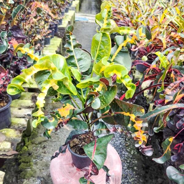 Окрас кротонов зависит от сезона. Даже яркие сорта могут приехать с зелеными листьями. По мере роста при достаточном количестве тепла и света при смене сезона они окрашиваются в сортовые цвета.