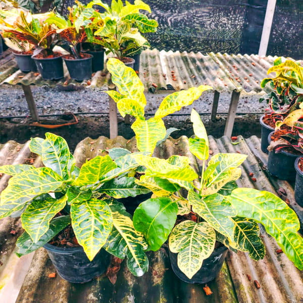 Окрас кротонов зависит от сезона. Даже яркие сорта могут приехать с зелеными листьями. По мере роста при достаточном количестве тепла и света при смене сезона они окрашиваются в сортовые цвета.