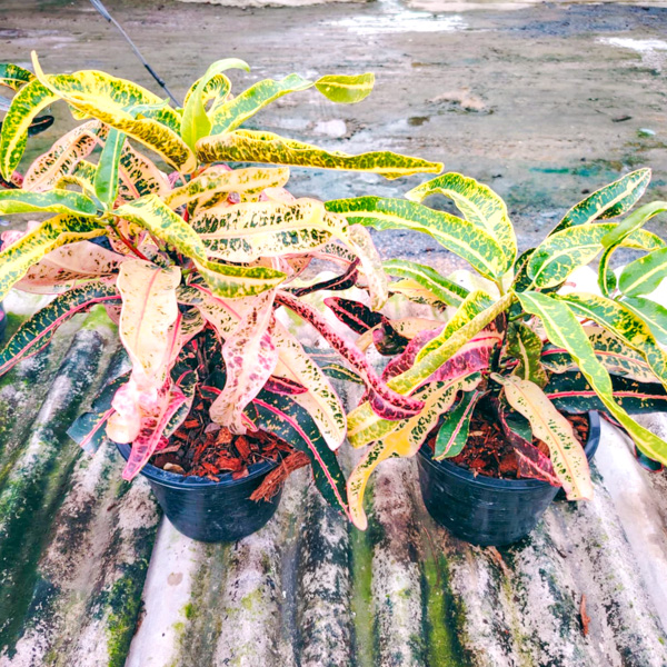 Окрас кротонов зависит от сезона. Даже яркие сорта могут приехать с зелеными листьями. По мере роста при достаточном количестве тепла и света при смене сезона они окрашиваются в сортовые цвета.