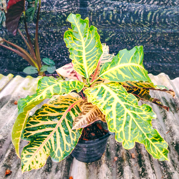 Окрас кротонов зависит от сезона. Даже яркие сорта могут приехать с зелеными листьями. По мере роста при достаточном количестве тепла и света при смене сезона они окрашиваются в сортовые цвета.