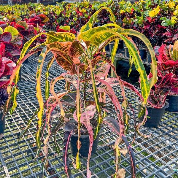 Окрас кротонов зависит от сезона. Даже яркие сорта могут приехать с зелеными листьями. По мере роста при достаточном количестве тепла и света при смене сезона они окрашиваются в сортовые цвета.