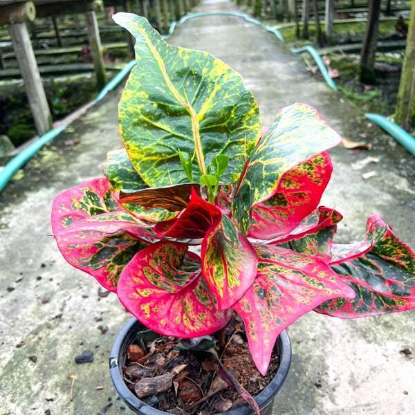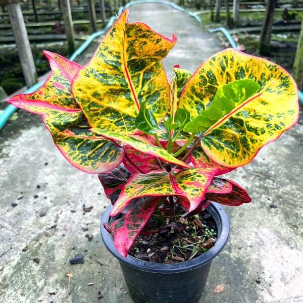 Окрас кротонов зависит от сезона. Даже яркие сорта могут приехать с зелеными листьями. По мере роста при достаточном количестве тепла и света при смене сезона они окрашиваются в сортовые цвета.