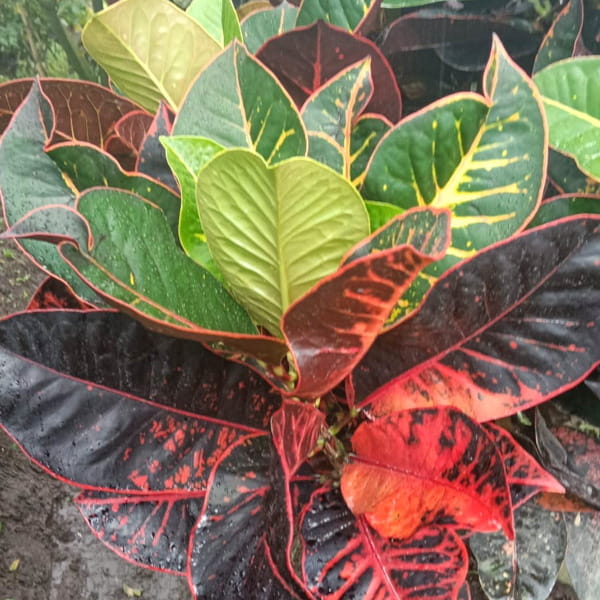 Окрас кротонов зависит от сезона. Даже яркие сорта могут приехать с зелеными листьями. По мере роста при достаточном количестве тепла и света при смене сезона они окрашиваются в сортовые цвета.