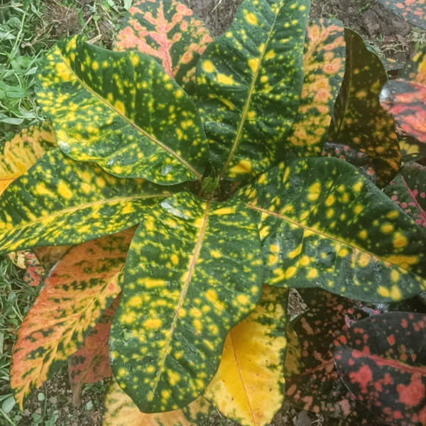 Окрас кротонов зависит от сезона. Даже яркие сорта могут приехать с зелеными листьями. По мере роста при достаточном количестве тепла и света при смене сезона они окрашиваются в сортовые цвета.