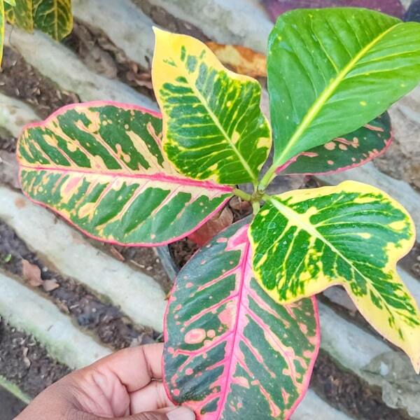 Окрас кротонов зависит от сезона. Даже яркие сорта могут приехать с зелеными листьями. По мере роста при достаточном количестве тепла и света при смене сезона они окрашиваются в сортовые цвета.