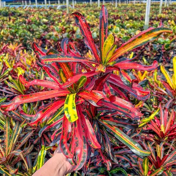 Окрас кротонов зависит от сезона. Даже яркие сорта могут приехать с зелеными листьями. По мере роста при достаточном количестве тепла и света при смене сезона они окрашиваются в сортовые цвета.