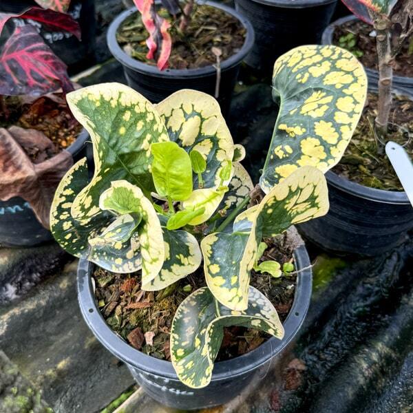 Окрас кротонов зависит от сезона. Даже яркие сорта могут приехать с зелеными листьями. По мере роста при достаточном количестве тепла и света при смене сезона они окрашиваются в сортовые цвета.