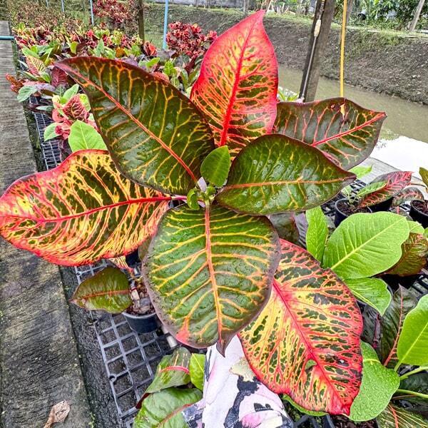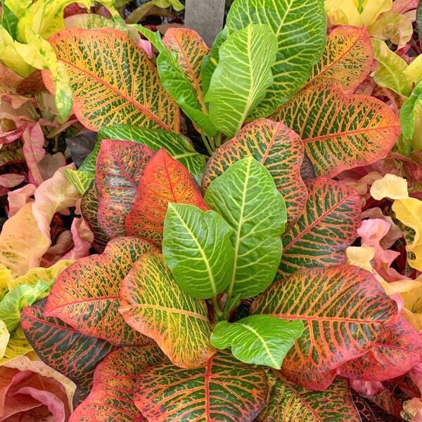 Окрас кротонов зависит от сезона. Даже яркие сорта могут приехать с зелеными листьями. По мере роста при достаточном количестве тепла и света при смене сезона они окрашиваются в сортовые цвета.