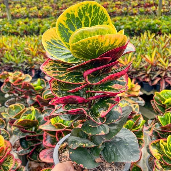 Окрас кротонов зависит от сезона. Даже яркие сорта могут приехать с зелеными листьями. По мере роста при достаточном количестве тепла и света при смене сезона они окрашиваются в сортовые цвета.