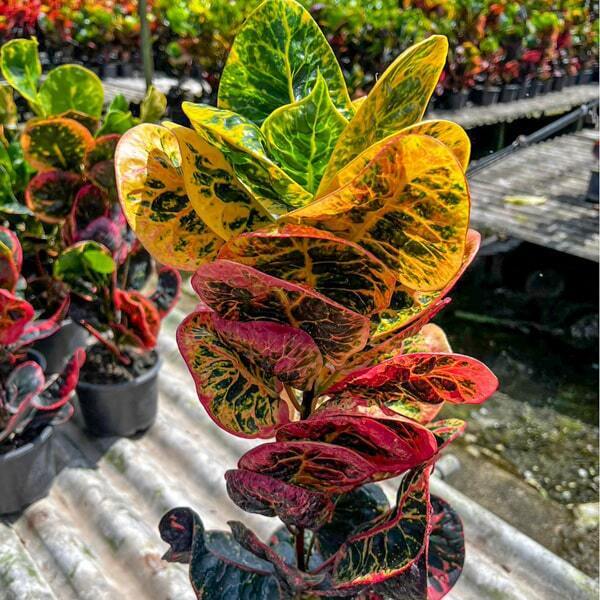 Окрас кротонов зависит от сезона. Даже яркие сорта могут приехать с зелеными листьями. По мере роста при достаточном количестве тепла и света при смене сезона они окрашиваются в сортовые цвета.