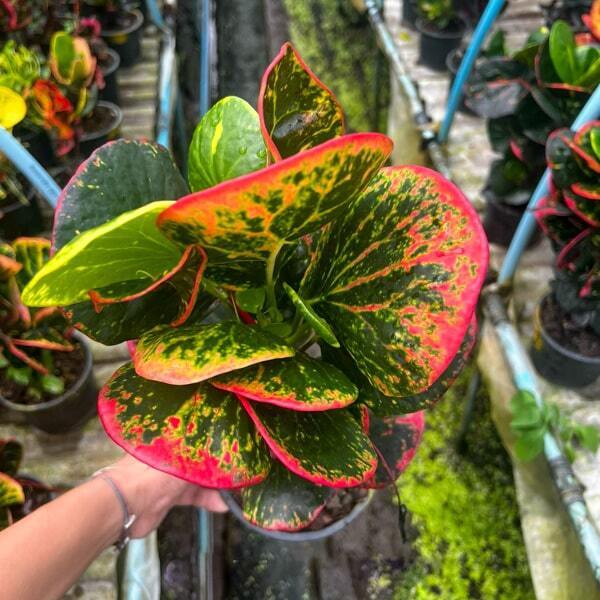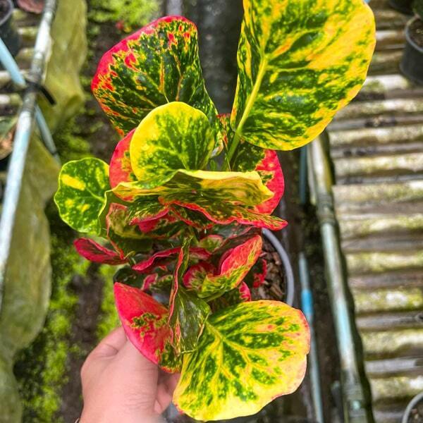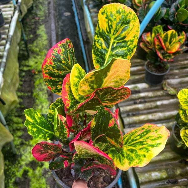 Окрас кротонов зависит от сезона. Даже яркие сорта могут приехать с зелеными листьями. По мере роста при достаточном количестве тепла и света при смене сезона они окрашиваются в сортовые цвета.