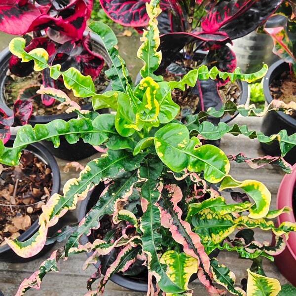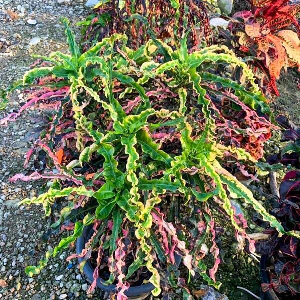 Окрас кротонов зависит от сезона. Даже яркие сорта могут приехать с зелеными листьями. По мере роста при достаточном количестве тепла и света при смене сезона они окрашиваются в сортовые цвета.