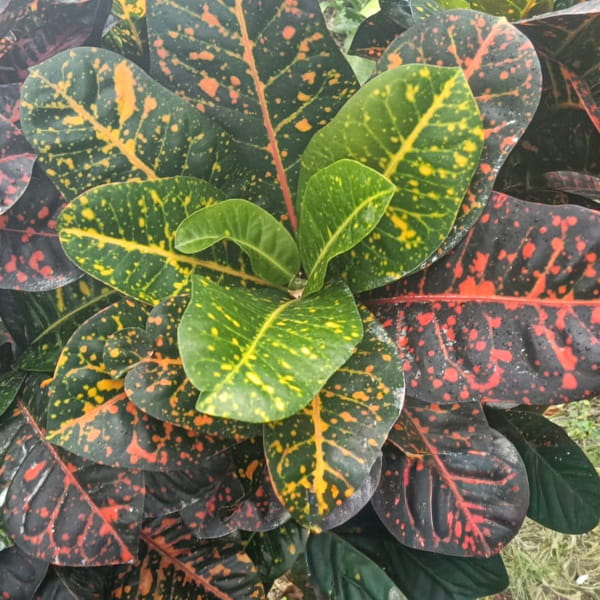 Окрас кротонов зависит от сезона. Даже яркие сорта могут приехать с зелеными листьями. По мере роста при достаточном количестве тепла и света при смене сезона они окрашиваются в сортовые цвета.