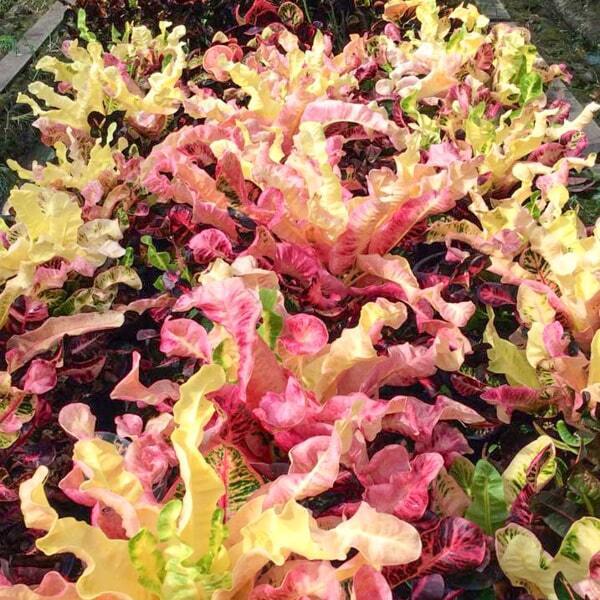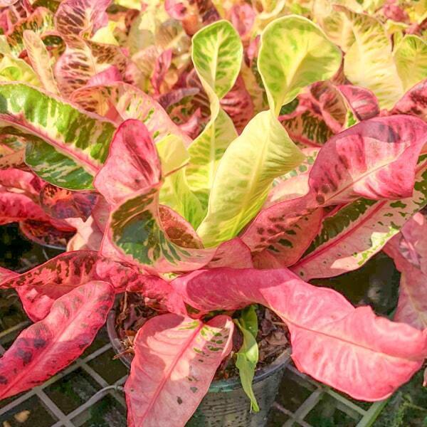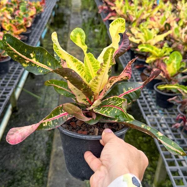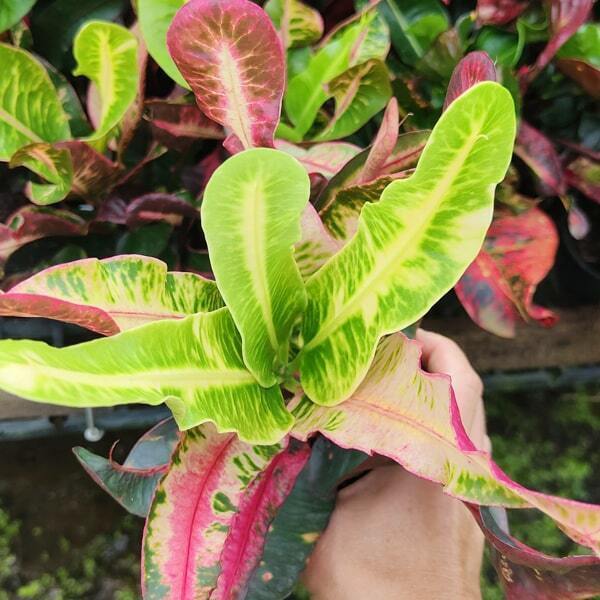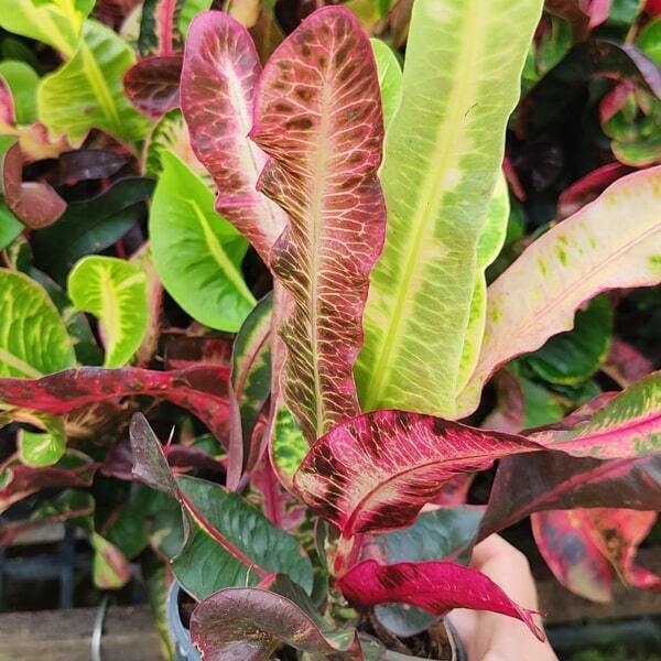 Окрас кротонов зависит от сезона. Даже яркие сорта могут приехать с зелеными листьями. По мере роста при достаточном количестве тепла и света при смене сезона они окрашиваются в сортовые цвета.