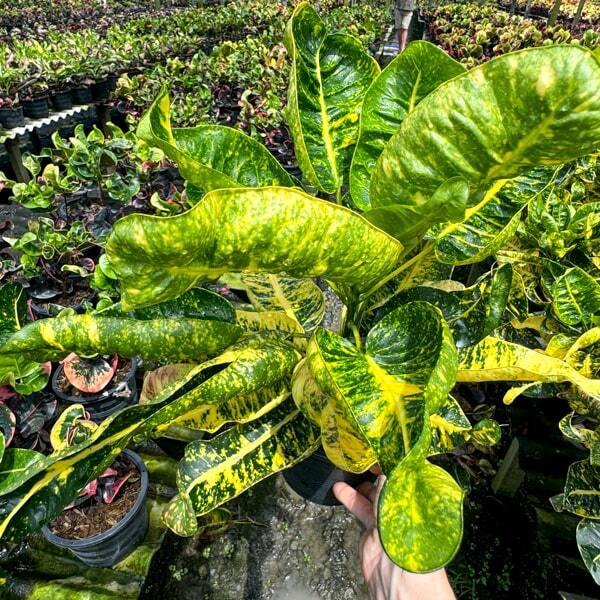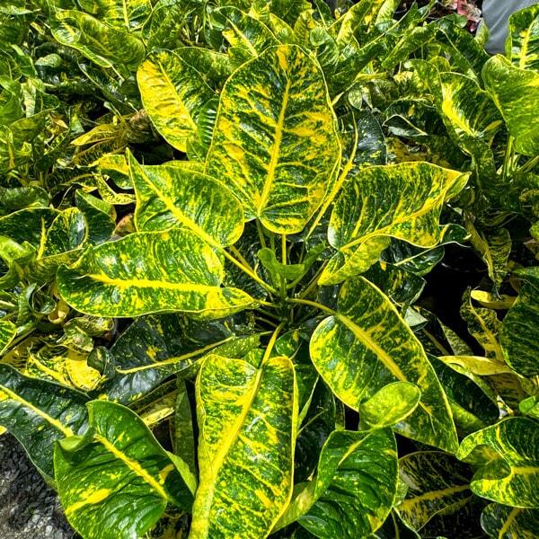 Окрас кротонов зависит от сезона. Даже яркие сорта могут приехать с зелеными листьями. По мере роста при достаточном количестве тепла и света при смене сезона они окрашиваются в сортовые цвета.