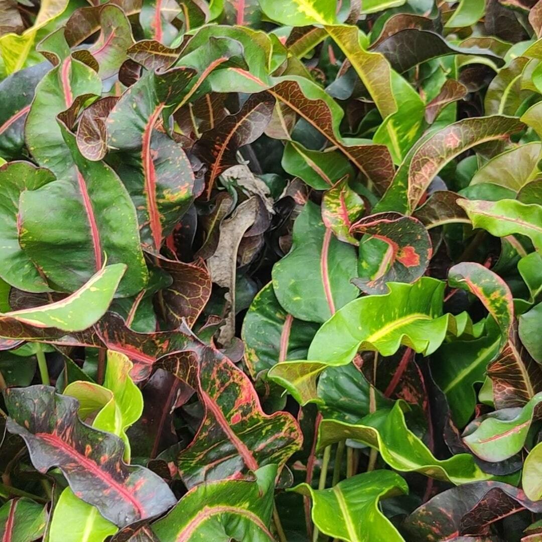 Окрас кротонов зависит от сезона. Даже яркие сорта могут приехать с зелеными листьями. По мере роста при достаточном количестве тепла и света при смене сезона они окрашиваются в сортовые цвета.