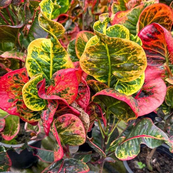 Окрас кротонов зависит от сезона. Даже яркие сорта могут приехать с зелеными листьями. По мере роста при достаточном количестве тепла и света при смене сезона они окрашиваются в сортовые цвета.