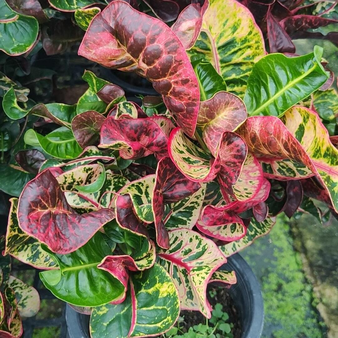 Окрас кротонов зависит от сезона. Даже яркие сорта могут приехать с зелеными листьями. По мере роста при достаточном количестве тепла и света при смене сезона они окрашиваются в сортовые цвета.