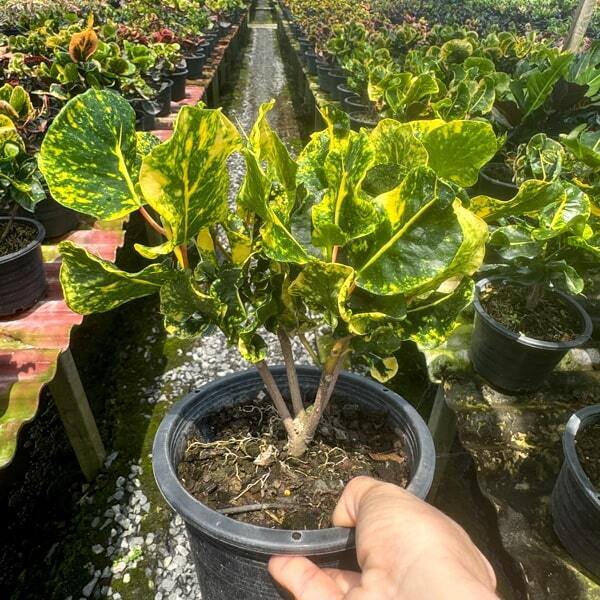 Окрас кротонов зависит от сезона. Даже яркие сорта могут приехать с зелеными листьями. По мере роста при достаточном количестве тепла и света при смене сезона они окрашиваются в сортовые цвета.