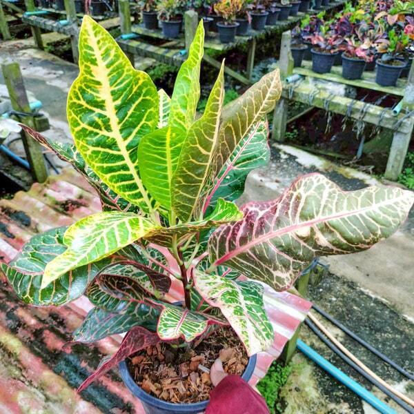 Окрас кротонов зависит от сезона. Даже яркие сорта могут приехать с зелеными листьями. По мере роста при достаточном количестве тепла и света при смене сезона они окрашиваются в сортовые цвета.