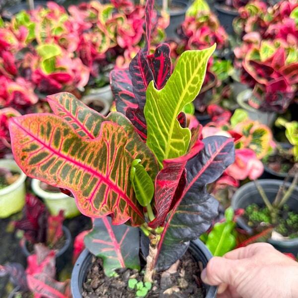 Окрас кротонов зависит от сезона. Даже яркие сорта могут приехать с зелеными листьями. По мере роста при достаточном количестве тепла и света при смене сезона они окрашиваются в сортовые цвета.