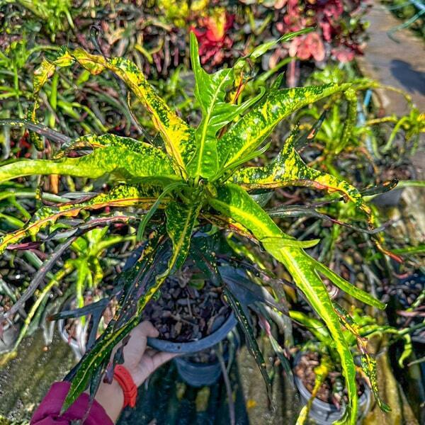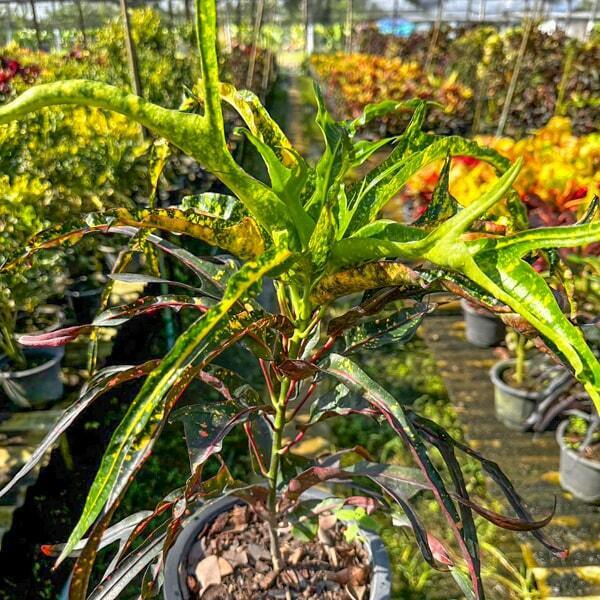 Окрас кротонов зависит от сезона. Даже яркие сорта могут приехать с зелеными листьями. По мере роста при достаточном количестве тепла и света при смене сезона они окрашиваются в сортовые цвета.