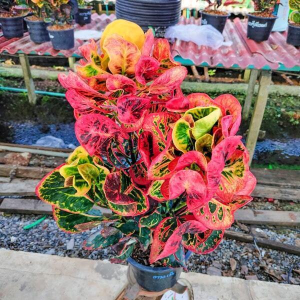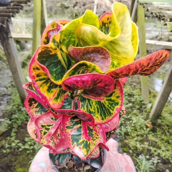 Окрас кротонов зависит от сезона. Даже яркие сорта могут приехать с зелеными листьями. По мере роста при достаточном количестве тепла и света при смене сезона они окрашиваются в сортовые цвета.