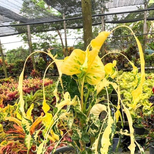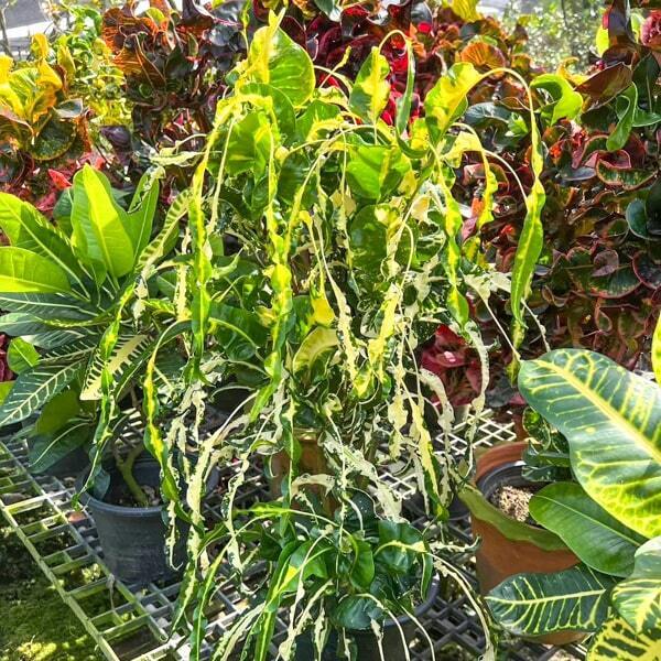 Окрас кротонов зависит от сезона. Даже яркие сорта могут приехать с зелеными листьями. По мере роста при достаточном количестве тепла и света при смене сезона они окрашиваются в сортовые цвета.