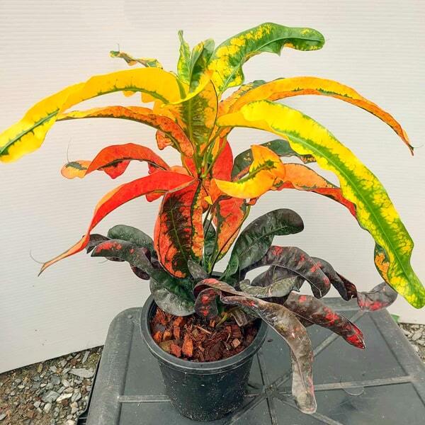 Окрас кротонов зависит от сезона. Даже яркие сорта могут приехать с зелеными листьями. По мере роста при достаточном количестве тепла и света при смене сезона они окрашиваются в сортовые цвета.