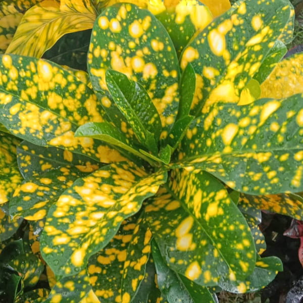 Окрас кротонов зависит от сезона. Даже яркие сорта могут приехать с зелеными листьями. По мере роста при достаточном количестве тепла и света при смене сезона они окрашиваются в сортовые цвета.