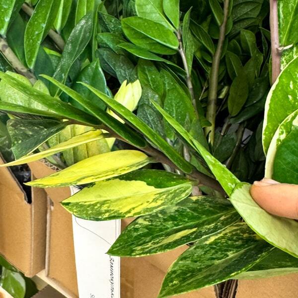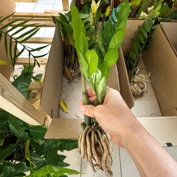 ОКС – замиокулькасы приедут без горшка и грунта, с открытой корневой системой. Молодое растение с клубнем и 1-3 рахисами – зависит от размера. Может быть 1 крупный рахис 20-30 см, может быть 2-3 небольших рахиса 8-15 см.
